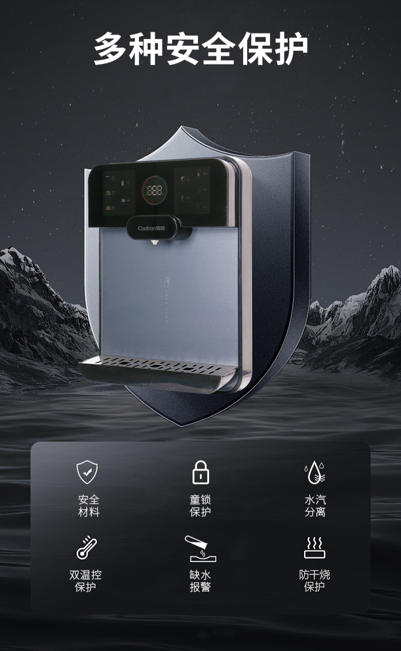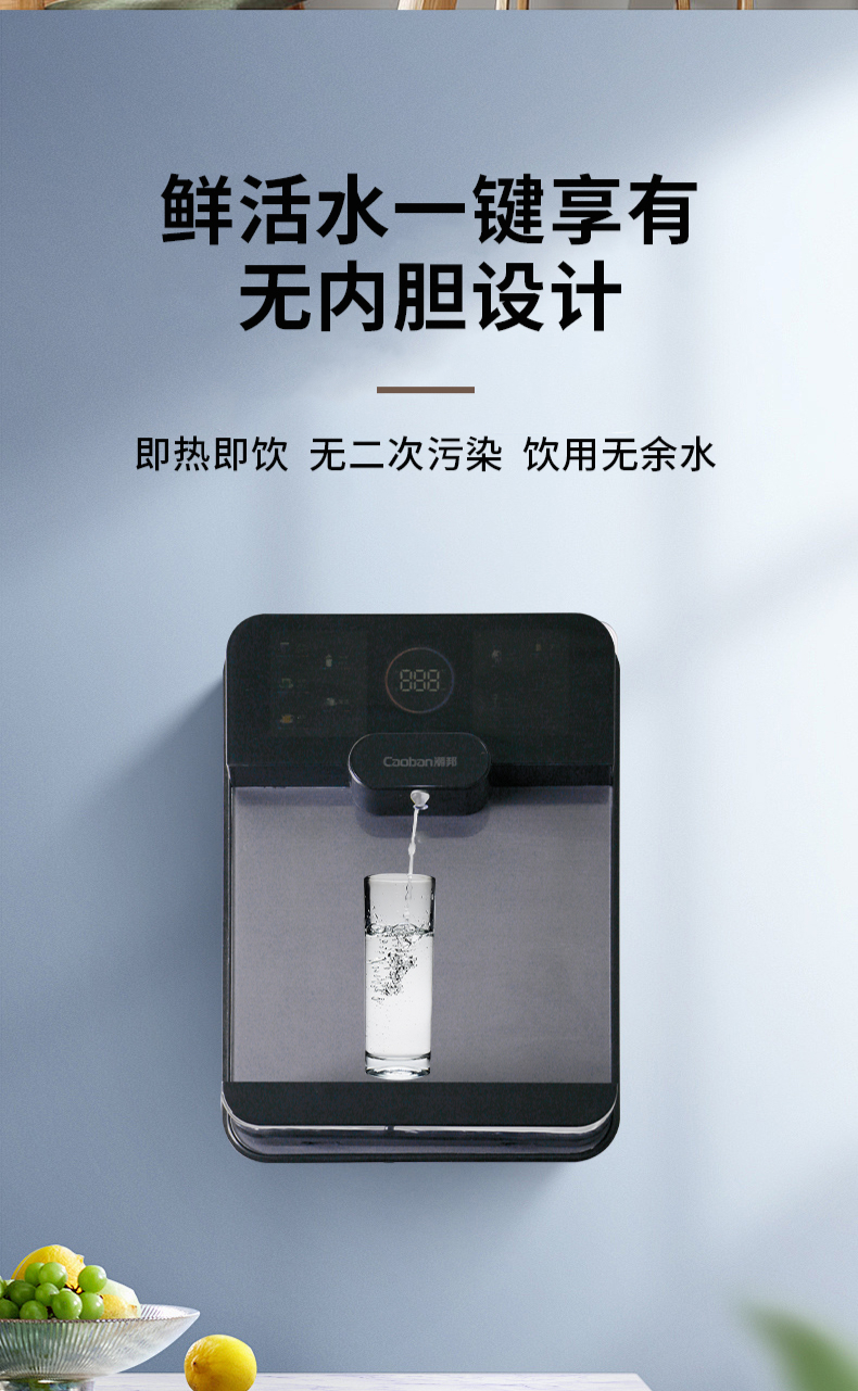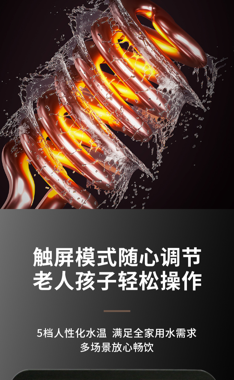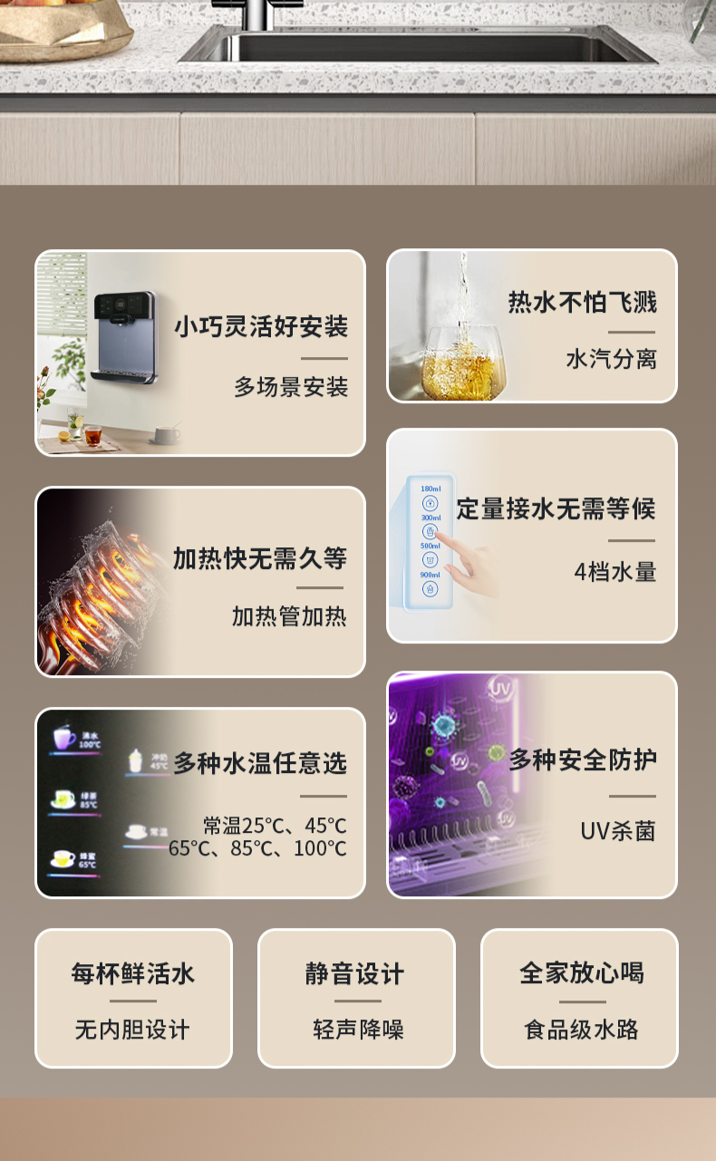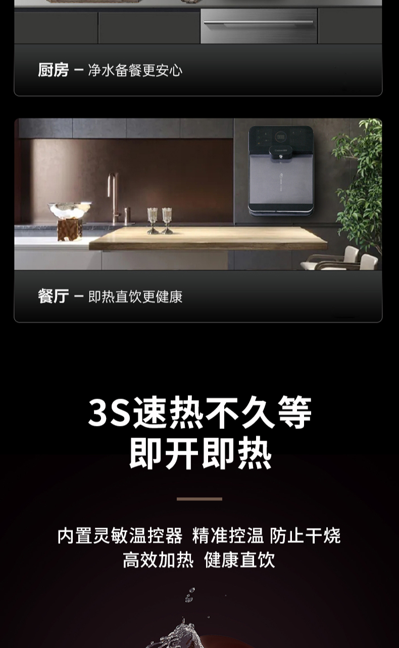 3秒速熱,5檔水溫,4檔水量,水汽分離,UV紫外線抑菌,無內(nèi)膽即熱即飲,全通量RO凈水器通用,多重安全保護(hù)