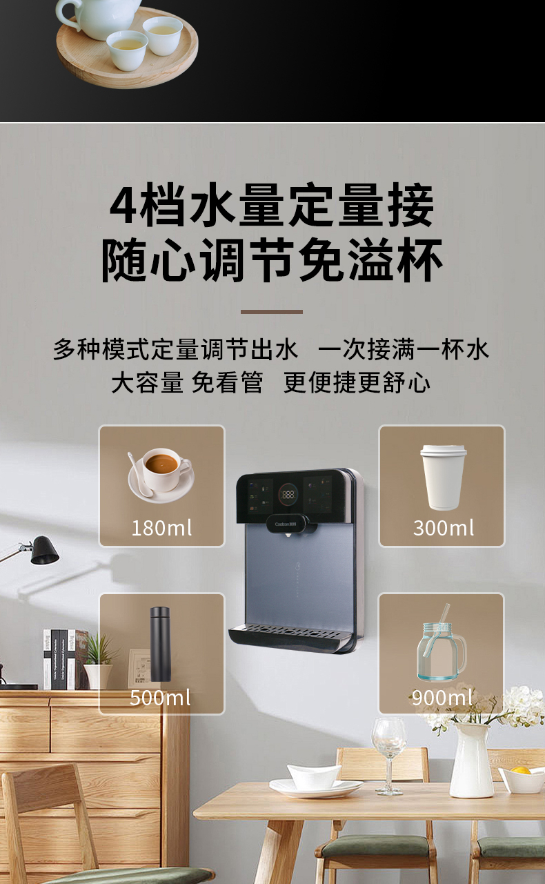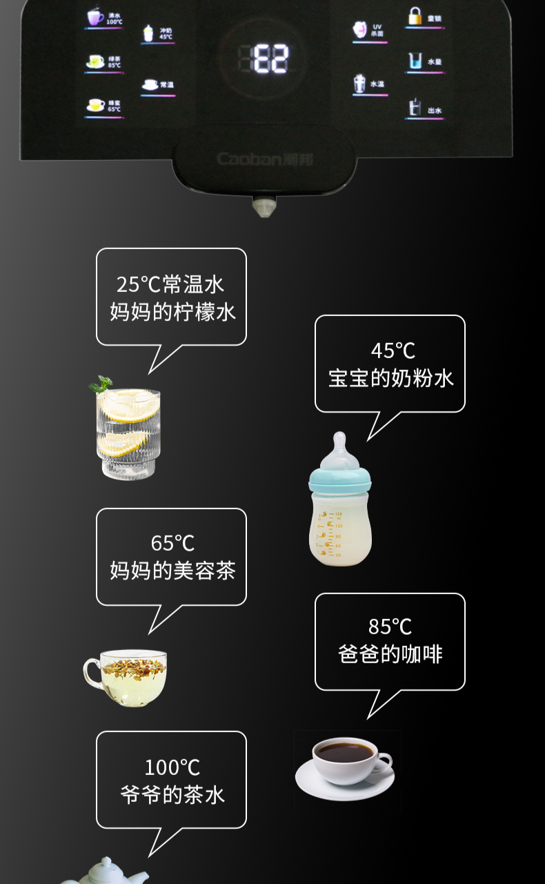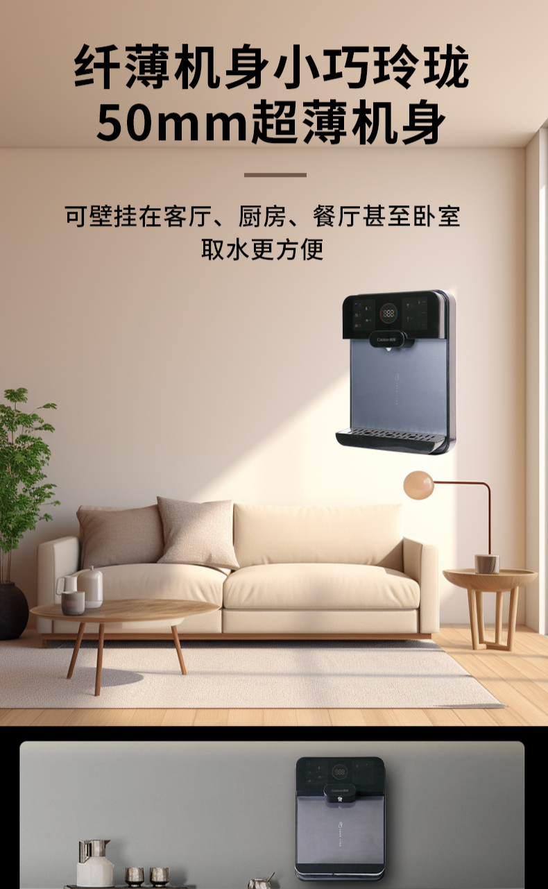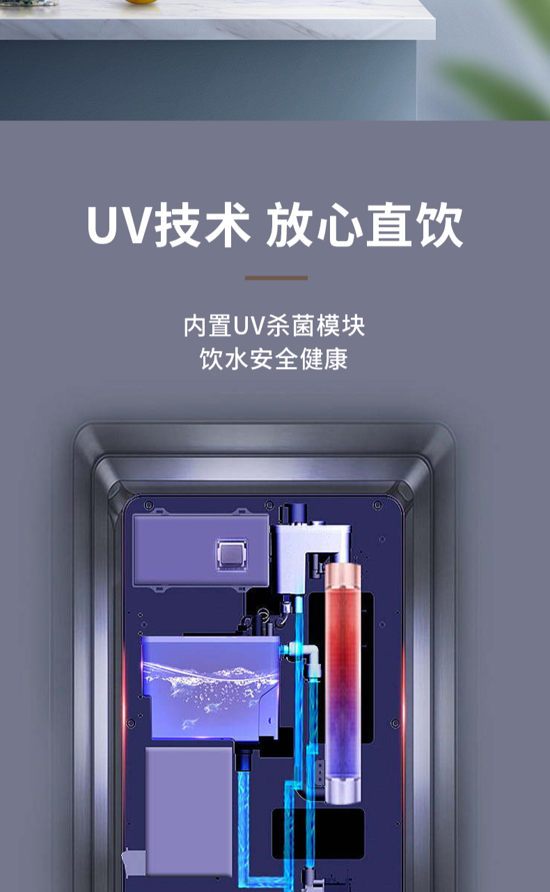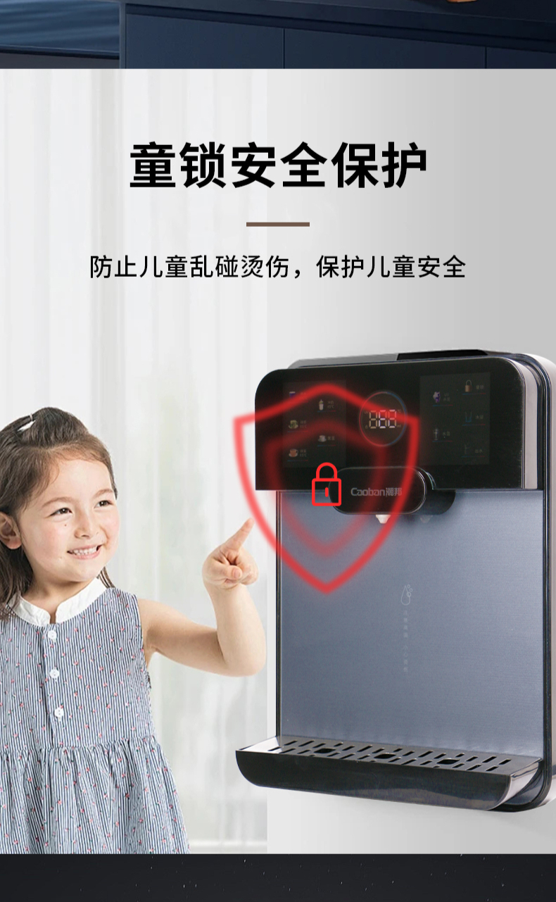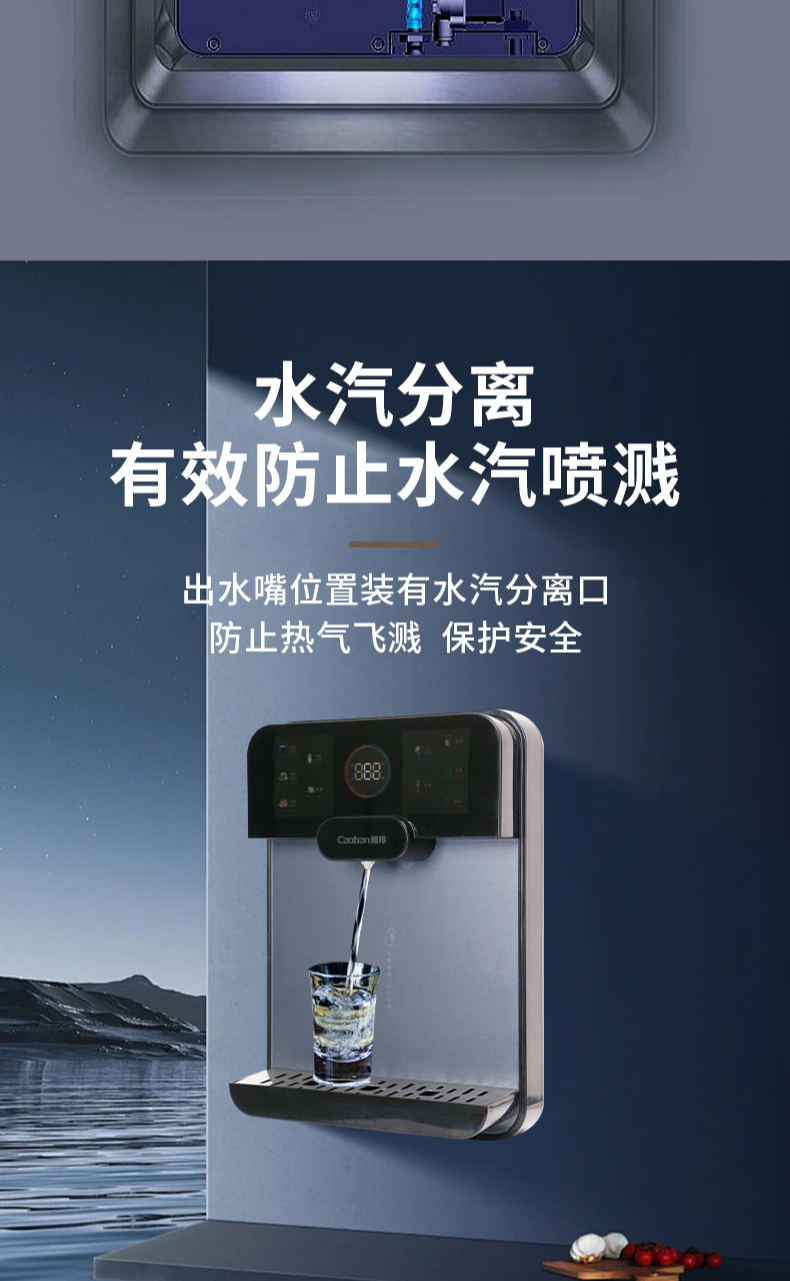 3秒速熱,5檔水溫,4檔水量,水汽分離,UV紫外線抑菌,無內(nèi)膽即熱即飲,全通量RO凈水器通用,多重安全保護(hù)