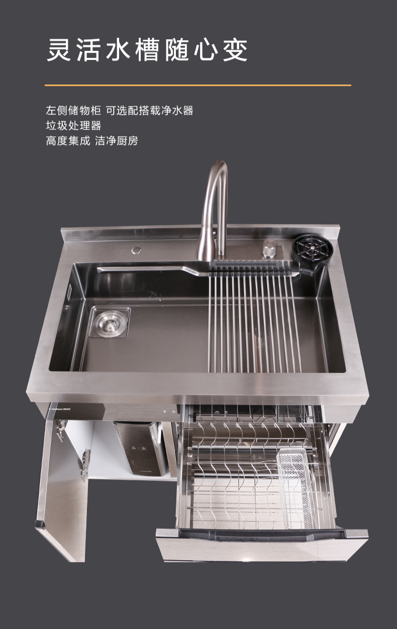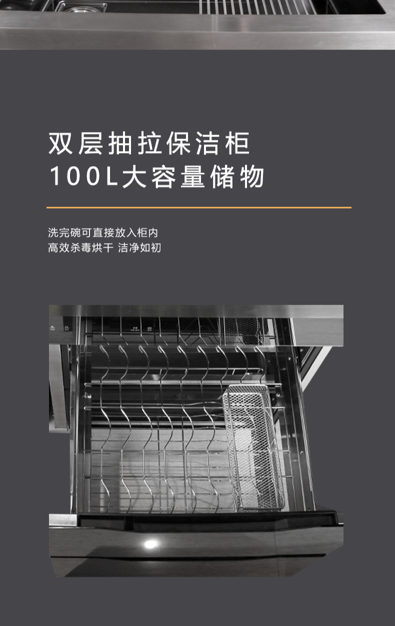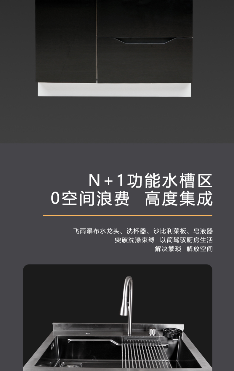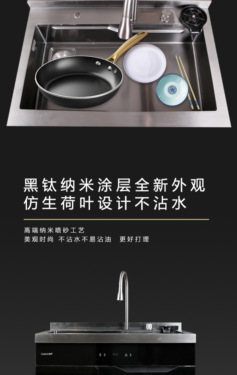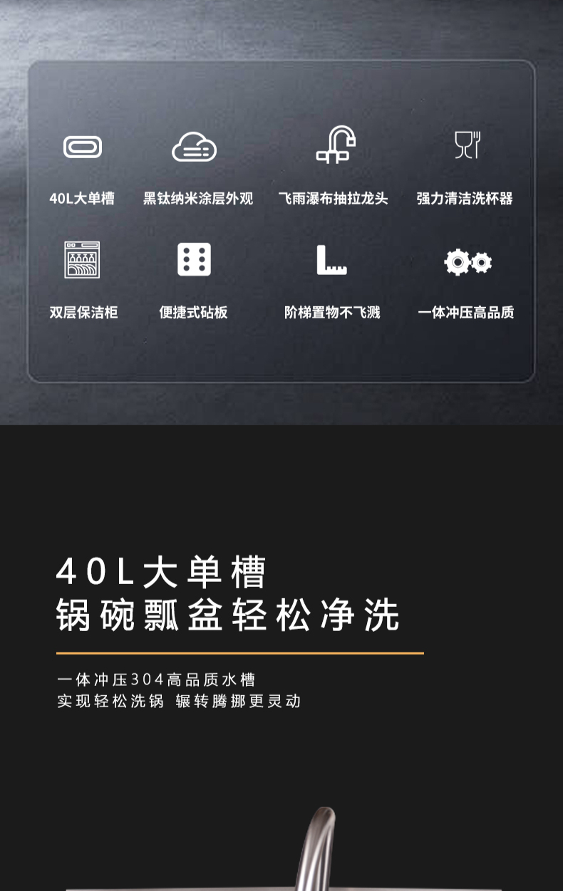 40L大單槽,黑鈦納米涂層,強(qiáng)力清潔洗杯器,雙層保潔柜,階梯置物不飛濺,一體沖壓